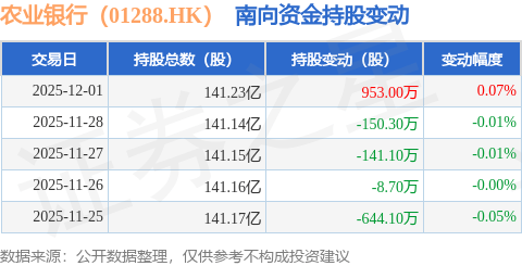 证券之星消息,12月1日南向资金增持953.0万股农业银行(01288.HK)。近5个交易日中,获南向资金增持的有1天,累计净增持8.8万股。近20个交易日中,获南向资金减持的有10天,累计净减持1222.37万股。截至目前,南向资金持有农业银行(01288.HK)141.23亿股,占公司已发行普通股的45.94%。