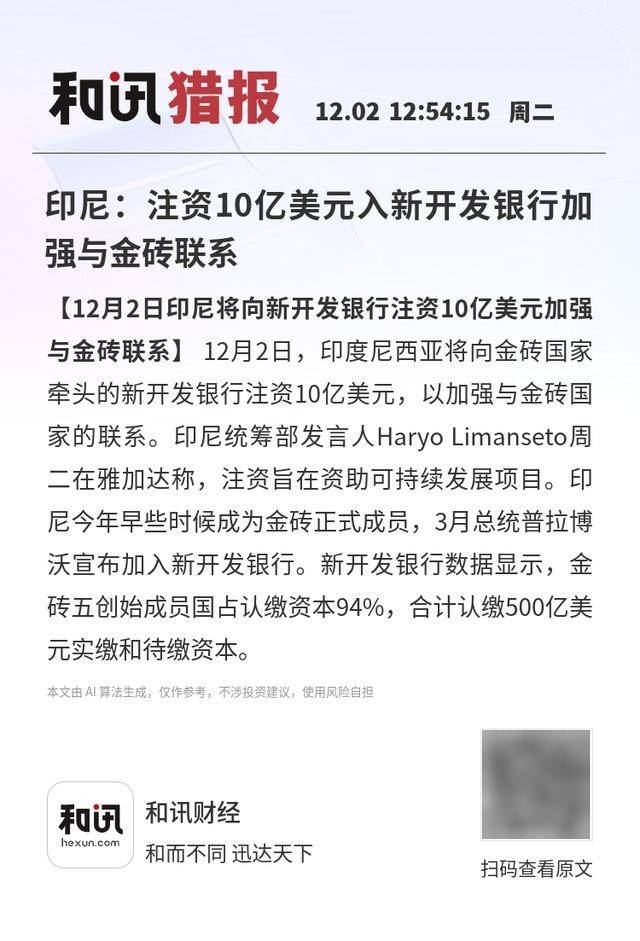 【12月2日印尼将向新开发银行注资10亿美元加强与金砖联系】12月2日,印度尼西亚将向金砖国家牵头的新开发银行注资10亿美元,以加强与金砖国家的联系。印尼统筹部发言人Haryo Limanseto周二在雅加达称,注资旨在资助可持续发展项目。印尼今年早些时候成为金砖正式成员,3月总统普拉博沃宣布加入新开发银行。新开发银行数据显示,金砖五创始成员国占认缴资本94%,合计认缴500亿美元实缴和待缴资本。