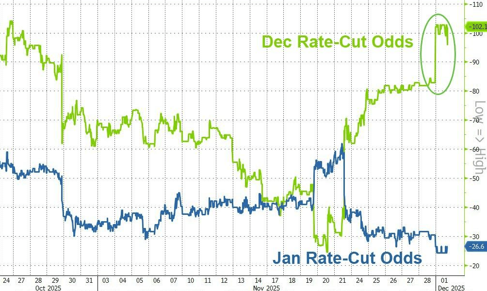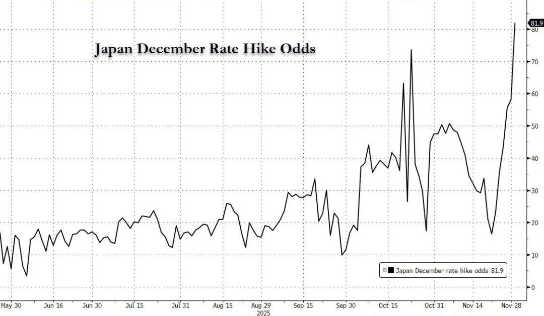 市场反应立竿见影,市场对日本央行12月加息的可能性定价从十天前的20%激增到了 80%。此前,美联储的沟通混乱一度将12 月降息的可能性从80%降低到30%,之后又提高到了100%。