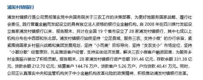 此外,浦发银行半年报显示,截至今年上半年末,浦发银行共计在全国19个省市设立了28家浦发村镇银行,其中七成以上机构分布在中西部和东北部。报告期末,28家浦发村镇银行资产总额391.46亿元,存款余额331.38亿元,贷款余额212.70亿元,结算客户144.76万户,贷款客户5.26万户,户均贷款40.41万元。