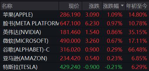 科技股成为此次反弹的领头羊。科技七巨头中,苹果涨1.09%,Meta涨0.97%,英伟达涨0.86%,微软涨0.67%,谷歌母公司Alphabet涨0.29%,亚马逊也小幅上涨。特斯拉虽略有下跌,但整体科技板块的强势表现仍为市场带来积极信号。