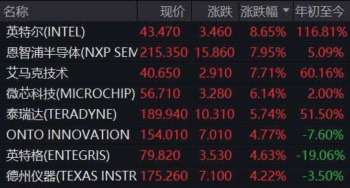 芯片股方面,英特尔表现尤为突出,大涨超8%。这主要得益于市场对其未来业绩的乐观预期,以及英特尔可能为苹果生产M系列芯片的消息刺激。此外,恩智浦半导体涨近8%,微芯科技涨超6%,费城半导体指数整体上涨1.83%,显示出芯片行业的强劲复苏势头。