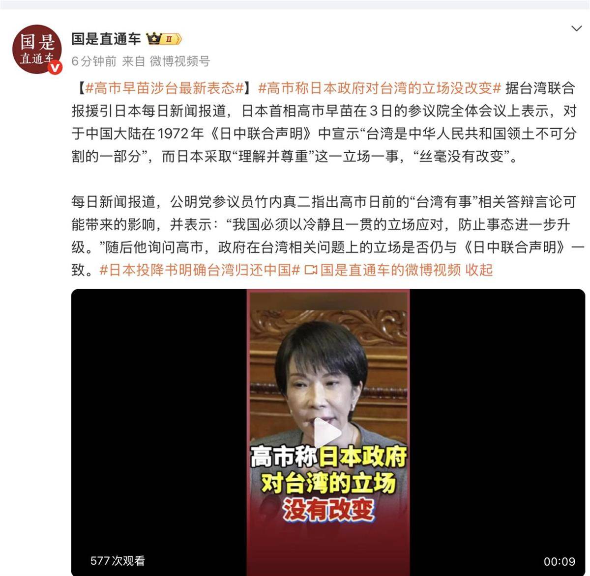据国是直通车、台湾联合报援引日本每日新闻报道,日本首相高市早苗在12月3日的参议院全体会议上表示,对于中国大陆在1972年《日中联合声明》中宣示“台湾是中华人民共和国领土不可分割的一部分”,而日本采取“理解并尊重”这一立场一事,“丝毫没有改变”。