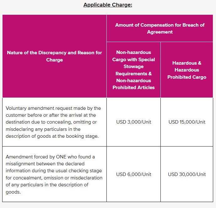 ONE强制修改:若ONE在常规检查阶段中发现申报信息与实际信息不符,存在隐瞒、遗漏或错误申报商品的情况,进而导致强制修改,收费标准为30000美元/箱。