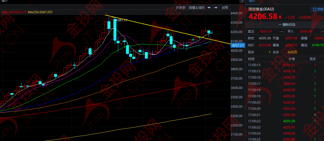 隔夜,现货黄金经历了一次典型的获利了结过程,黄金最低触及4164美元附近,下跌幅度约为1.5%,尾盘时段,金价迅速回升至4200美元上方,最终收报4205.57美元,跌幅收窄至0.6%。今日欧市盘中,黄金窄幅震荡,目前在4200美元附近徘徊。