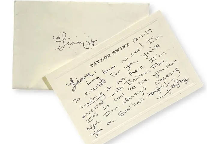 搜狐娱乐讯 近日,据外媒,霉霉Taylor Swift于2017年写给利亚姆·佩恩的亲笔信,日前在拍卖会上以7500英镑成交。据悉,利亚姆将其赠予了一位“亲密同事”。霉霉写道:“利亚姆,好久不见!真为你感到兴奋,你在那边太出色了。我完全迷上了《Bedroom Floor》。这样远远看着你的成长感觉真棒,我会一直为你加油的。”