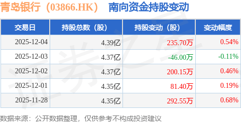 证券之星消息,12月4日南向资金增持235.7万股青岛银行(03866.HK)。近5个交易日中,获南向资金增持的有4天,累计净增持763.8万股。近20个交易日中,获南向资金增持的有16天,累计净增持9826.6万股。截至目前,南向资金持有青岛银行(03866.HK)4.39亿股,占公司已发行普通股的19.16%。
