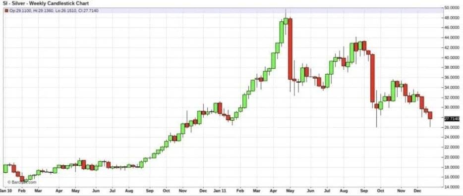 2010年末开始的牛市中,白银用八个月时间涨至48美元,随后几个月便回落至26美元。