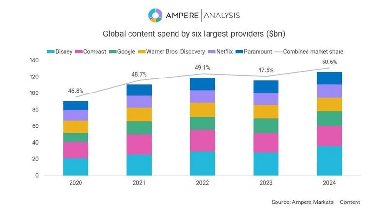 与此同时,内容成本居高不下。Ampere Analysis 数据显示,Disney(迪士尼)、Comcast(康卡斯特)、Google(谷歌)、WBD(华纳兄弟探索公司)、Netflix 和 Paramount(派拉蒙)等六大内容提供商,2024年将合计在内容上投资1260亿美元达到新高,并将占到整个内容支出领域的 51%,而这一比例在 2020 年为 47%。