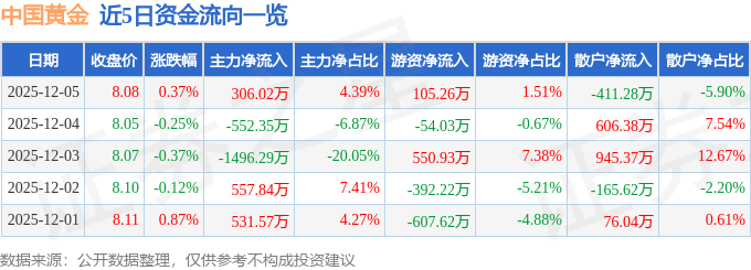证券之星消息,截至2025年12月5日收盘,中国黄金(600916)报收于8.08元,上涨0.37%,换手率0.52%,成交量8.66万手,成交额6973.82万元。