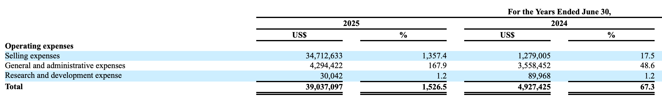 除了营收暴跌,其利润巨亏的最重要原因是销售费用暴涨,由2024财年的127.9万美元,增加到2025财年的3471.26万美元,增幅达1357.4%。