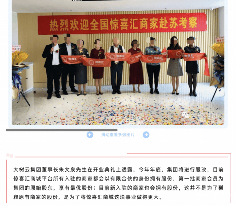 先是“惊喜汇”。2020年6月28日,惊喜汇商城线上剪彩仪式暨招商大会召开。根据“大树云惊喜汇”官方微信文章介绍,朱文泉自称“校长”,平台以“每月固定消费”和“全商城帮忙卖货”模式促进会员“裂变”,并以此发展多级经销商。