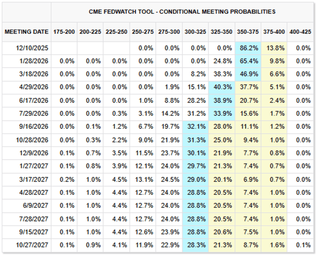 美联储降息预期明显升温,美联储12月降息或已成定局。由于近期美国就业市场数据疲软,多位联储官员公开支持降息。根据CME FedWatch工具,市场目前预计美联储在12月10日降息的可能性为86%。