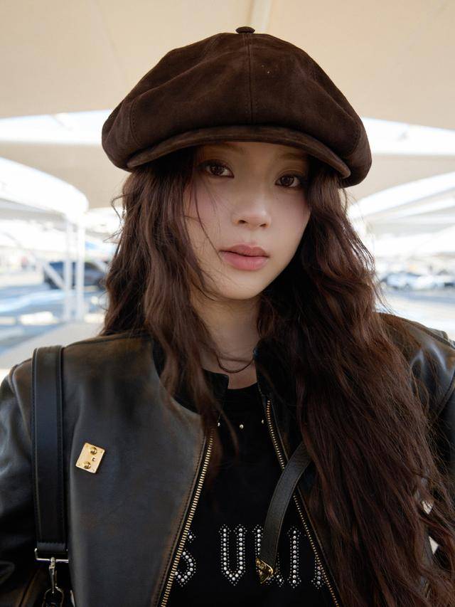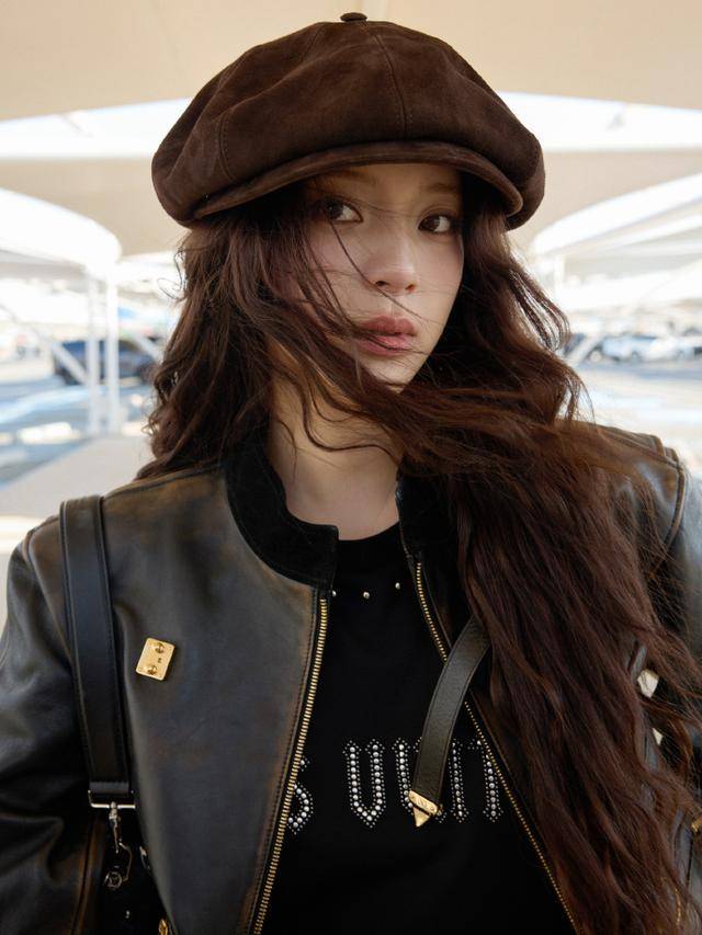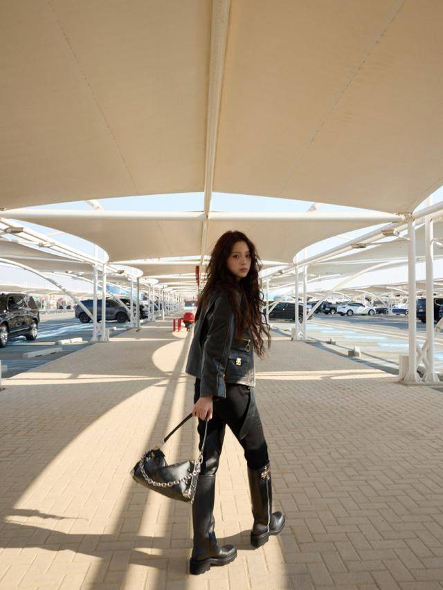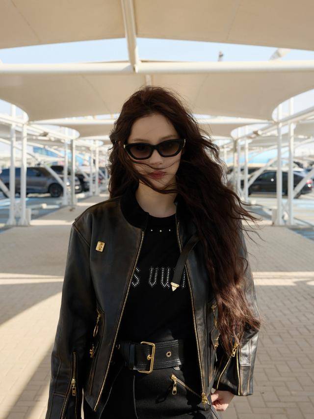 工作室放出的生图中,她身着黑色皮质夹克内搭LV金属字母T恤,下装是同色系工装裤,腰间宽腰带勒出蚂蚁腰,脚踩厚底长靴气场全开。