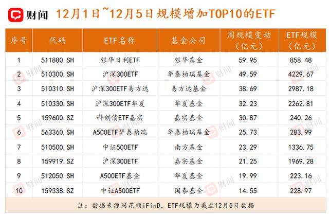 从上周ETF规模变动情况来看,银华日利ETF(511880.SH)在资金大幅净流入的推动下,成为全市场单周规模增长最多的ETF产品。其产品规模激增59.95亿元,达到858.48亿元。此外,沪深300ETF(510300.SH)、中证500ETF(510500.SH)等超千亿元级别的宽基ETF,也在市场反弹与资金回流的双重支撑下,实现显著的规模增长,周内规模增量位居前列。