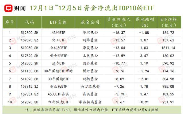 相比之下,风险相对集中的行业类ETF成为资金流出的重要区域,银行ETF(512800.SH)、化工ETF(159870.SZ)、黄金股ETF(517520.SH)以及证券ETF(512880.SH)单周净流出金额也均超过10亿元,侧面反映出投资者对部分高波动板块的阶段性避险情绪。