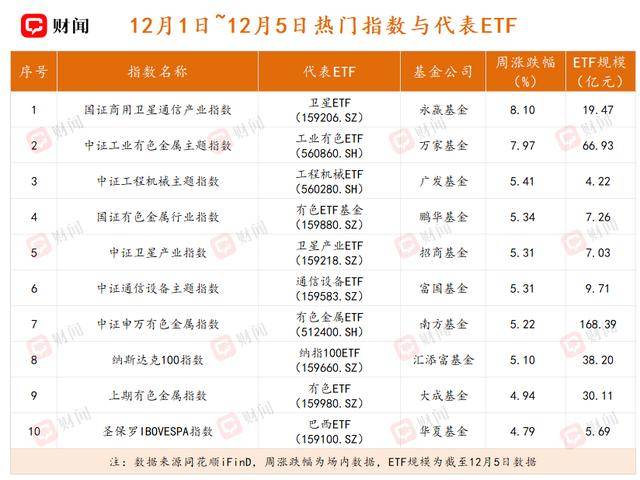 除了商业航天领域外,有色金属也成为上周市场的一大热点。受全球铜供应趋紧与需求持续增长的双重驱动,伦敦金属交易所(LME)铜价上周攀升至11705美元/吨,创下历史新高;同期,LME其他基本金属价格也普遍上扬。在此背景下,多只相关ETF表现亮眼——工业有色ETF(560860.SH)、有色ETF基金(159880.SZ)和有色金属ETF(512400.SH)等产品周内涨幅均超过5%。