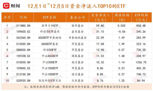 从具体标的来看,银华日利ETF(511880.SH)成为资金青睐的焦点,单只产品上周净流入高达59.8亿元。同时,跟踪中证A500和中证A1000指数的宽基ETF也备受关注。其中A500ETF华泰柏瑞(563360.SH)、A500ETF基金(512050.SH)、中证A500ETF(159338.SZ)以及中证500ETF(510500.SH)单周净流入均突破10亿元。