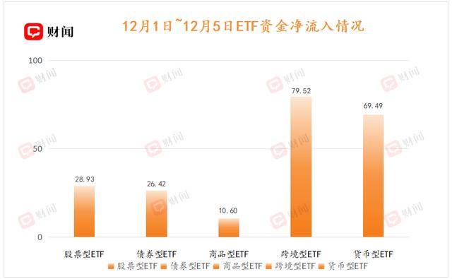 上周,股票型、债券型、商品型、跨境型及货币型等主要ETF类别均实现资金净流入。其中,风险最低的货币型ETF表现尤为突出,单周资金净流入69.49亿元,一定程度上显示出年末资金对低风险资产的偏好。