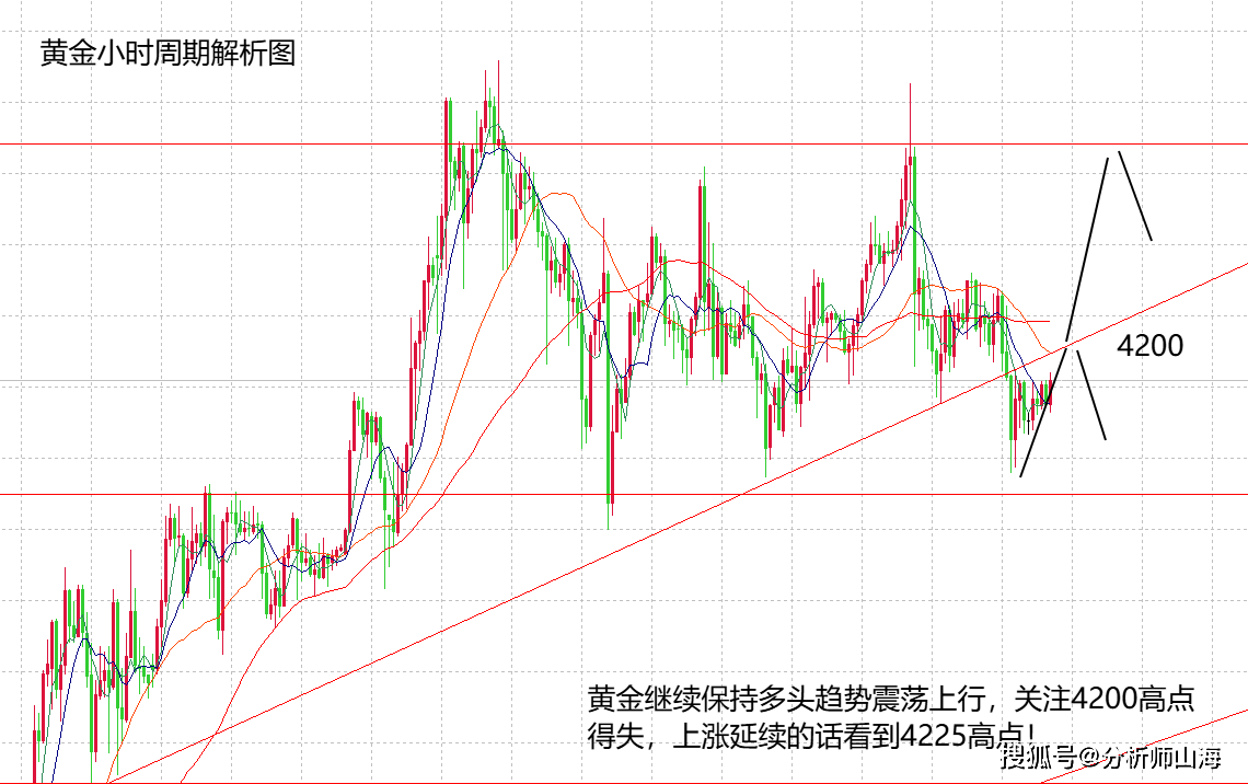 周一整体是先涨后跌,最高在4218,最低在4175,山海在看涨中实现了部分空间,可惜美盘消息面那一波下跌力度始料未及,导致周一坚持得多单被扫出局,在确定4175的双支撑效果后,山海继续给出做多的选择,目前多单获利持有中,继续看多头趋势的上涨空间。今天黄金继续上涨的话,上方关注4230高点,下跌的话关注4175低点。从技术面来看,其实震荡的行情改变不是很大,不管是日线周期还是H4周期,其实都没有太大的技术改观,日线周期还是在中轨之上,是绝对的强势,只不过现在市场缺少上涨的动力,多头延续可能在本周美联储利率决议后发生,到时候再看日线强阳的发展情况。H4周期就是标准的震荡区间,布林收窄,均线粘合,周一的下跌看似要向下破位,但目前连阳的k线还是收高上涨,所以,区间震荡明显,只要区间不破,就不必过分看多空的破位性行情。那么,今天的行情就先看张后看跌,亚欧盘预计会直接上涨,4190激进可以做多,上方关注4230高点,不破就短线看,美盘可能会此压制点回落,破位再看多头力度的延续性。