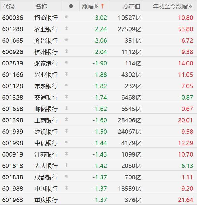 格隆汇12月10日|A股市场银行股普跌,截至半日收盘,招商银行跌3%,农业银行、齐鲁银行、杭州银行跌超2%,张家港行、兴业银行、常熟银行、交通银行跌近2%。