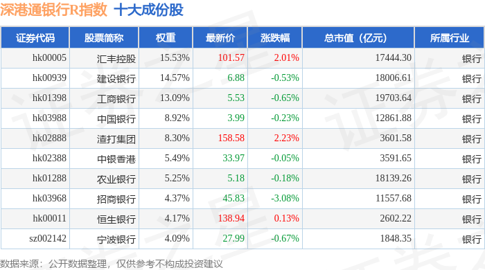 证券之星消息,12月10日,深港通银行R(483081)指数报收于12264.06点,跌0.45%,成交115.04亿元,换手率0.23%。当日该指数成份股中,上涨的有4家,渣打集团以2.23%的涨幅领涨,下跌的有24家,招商银行以3.08%的跌幅领跌。