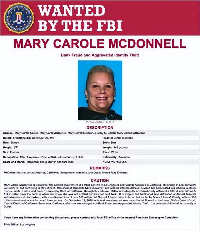 近日,美国联邦调查局称,一名70多岁的女子被列入通缉名单。她冒充麦克唐纳公司女继承人,从加利福尼亚州的银行和金融机构骗取了近3000万美元,并逃往迪拜。
