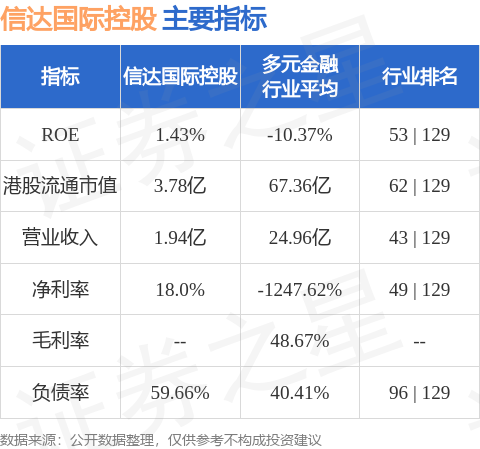 信达国际控股港股市值3.78亿港元,在多元金融行业中排名第62。主要指标见下表: