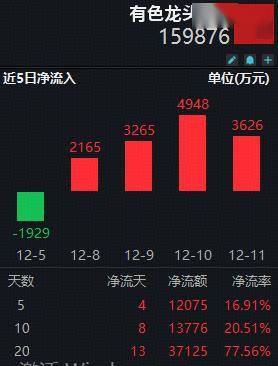截至昨日(12月11日)揽尽有色金属行业龙头的有色龙头ETF(159876)近4日连续吸金,合计金额1.4亿元,拉长时间来看,近20日累计吸金3.71亿元,反映资金看好有色金属板块后市表现,积极进场抢筹!