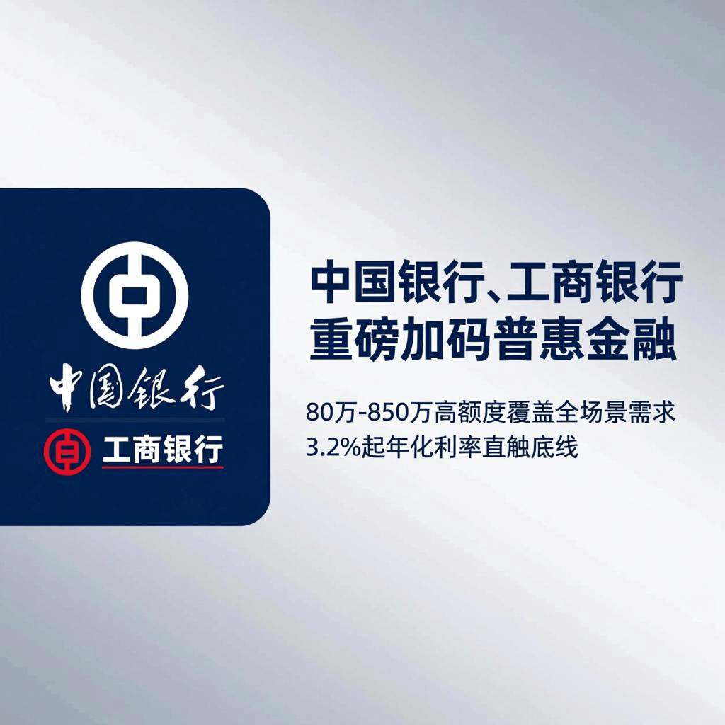 前言:2025年融资新政红利持续释放,中国银行、工商银行两大国有大行重磅加码普惠金融!打破“融资难、融资贵”的行业痛点,联手推出企业信用贷升级方案,80万-850万高额度覆盖全场景需求,3.2%起年化利率直触底线,无需抵押、极速审批,堪称企业发展的“强心针”与“及时雨”,政策窗口期错过再等一年!