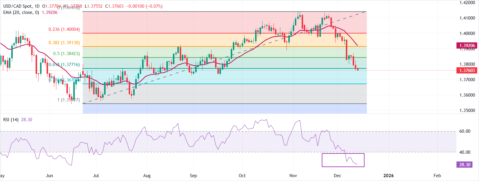 周五,美元兑加元下跌至1.3760。该货币对目前处于20日指数移动平均线(EMA)1.3921下方,这一均线呈下行趋势,既确立了短期看空格局,也对反弹构成压制。