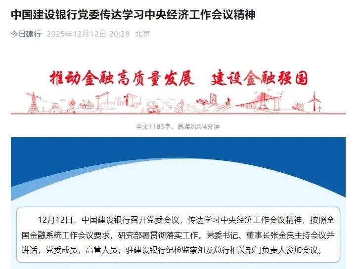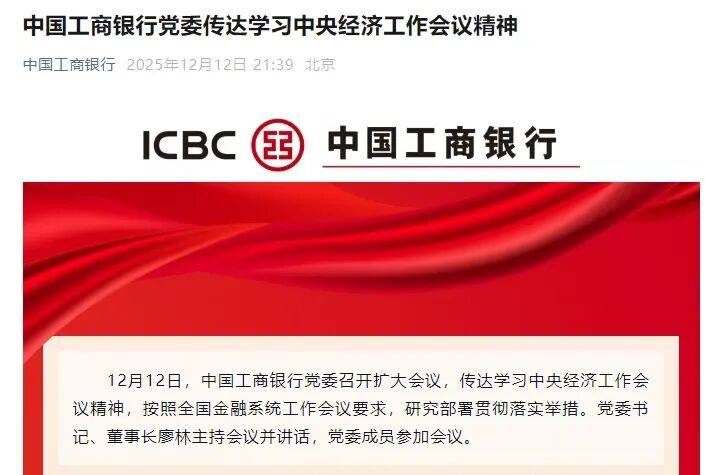 同日,工行、建行、农行、中行、邮储银行等国有大行召开党委会议,传达学习中央经济工作会议精神,结合全国金融系统工作会议要求,研究部署贯彻落实措施,明确2026年及 “十五五” 时期工作重点,为助力经济高质量发展、服务金融强国建设提供金融支撑。
