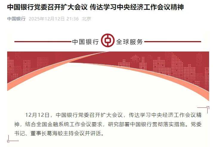 据中国人民银行官网消息,12月12日,中国人民银行党委书记、行长潘功胜主持召开党委会议,传达学习中央经济工作会议精神,落实全国金融系统工作会议要求,研究部署贯彻落实举措。中国人民银行各党委成员出席会议。