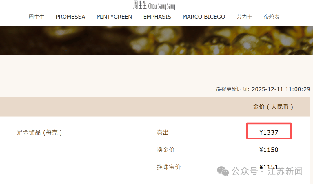 12月11日,国内黄金饰品价格对比显示,多家黄金珠宝品牌公布的境内足金首饰价格较前一日有所上调,周生生报价1337元/克,周大福报价1336元/克,老凤祥报价1335元/克,老庙黄金上海区域克价为1336元,六福珠宝报价1326元/克。