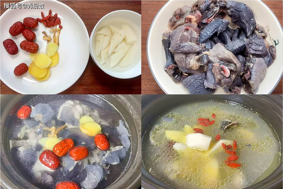 1. 乌鸡洗净斩块,冷水下锅焯水,捞出冲洗干净;山药去皮切段,红枣、枸杞洗净,黑豆提前浸泡2小时;