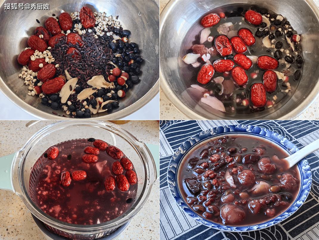 1. 黑豆、薏米、芡实提前浸泡4小时以上;紫米淘洗干净,红枣去核,桂圆肉、百合洗净;