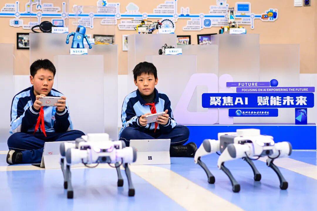 12月2日,杭州市保俶塔实验学校的学生们在人工智能通识课上学习如何给机器狗编程。新华社发