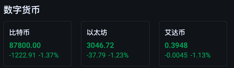 数字货币市场大跌。比特币跌破88000美元关口,跌超1%。