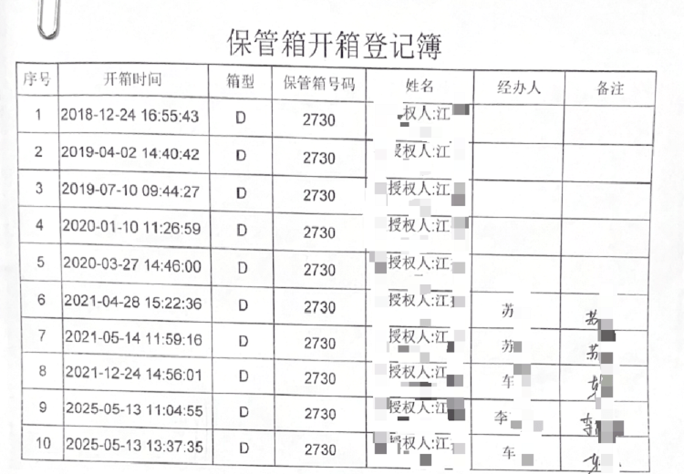 “根据银行规定,保管箱有两把钥匙,一把是银行工作人员持有,一把是我拿的,只有两把钥匙同时在一起才能打开保管箱。”江女士说,今年5月13日,她持身份证来到银行,在银行工作人员的带领下进入保管箱区域。两把钥匙插入打开2370号箱,发现箱内竟然是空的。工作人员再次核对系统,发现“箱号搞错”,又将她带到2730号箱位置,却见2730号箱门呈开启状态,箱内空无一物。“当时发现保管的物品不在后,我都傻眼了,当场拨打110报了警。”