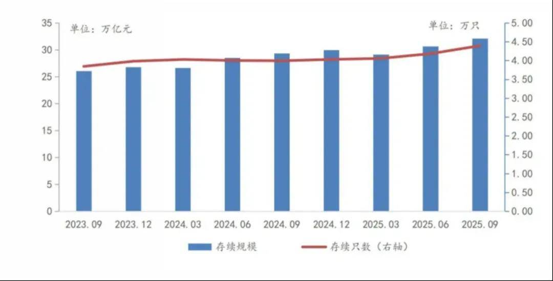 《中国银行业理财市场季度报告(2025年三季度)》(以下简称“银行理财三季报”)显示,截至2025年三季度末,全国共有181家银行机构和32家理财公司保有存续理财产品,产品总数达4.39万只,存续规模为32.13万亿元。其中,理财公司占据绝对大头,截至三季度末,32家理财公司的存量理财产品规模达到29.28万亿元,在全市场的占比高达91.13%。