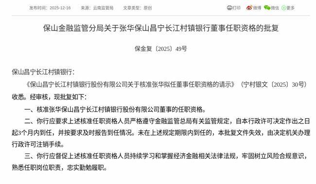 2025年12月16日,根据国家金融监督管理总局消息,《保山昌宁长江村镇银行股份有限公司关于核准张华拟任董事任职资格的请示》获得通过,批复张华保山昌宁长江村镇银行股份有限公司董事的任职资格。