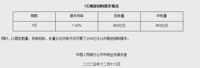 中新网12月18日电 据央行网站消息,2025年12月18日,中国人民银行以固定利率、数量招标方式开展了883亿元7天期逆回购操作。