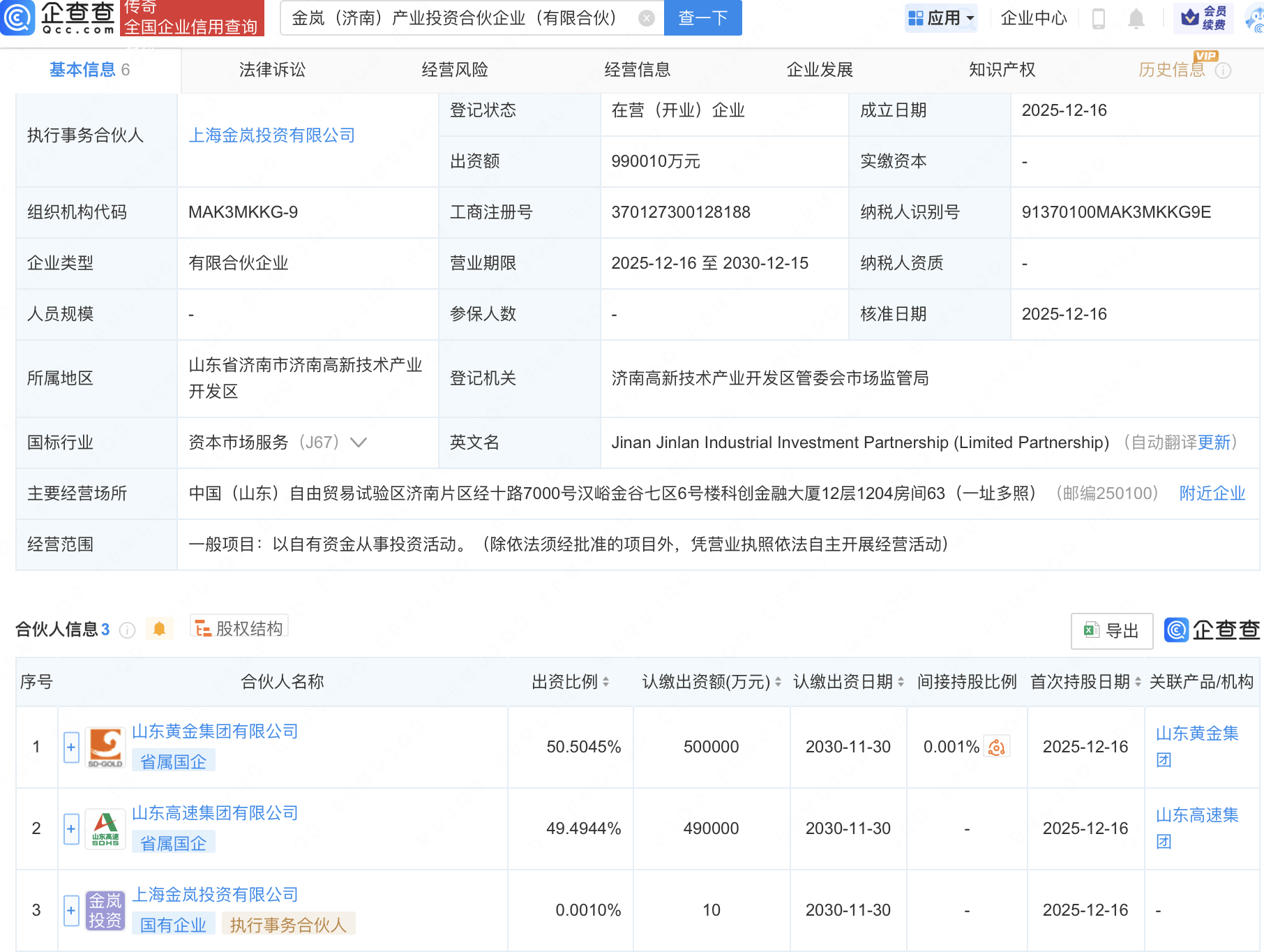 企查查APP显示,近日,金岚(济南)产业投资合伙企业(有限合伙)成立,出资额约99亿元,经营范围包含:以自有资金从事投资活动。企查查股权穿透显示,该企业由山东黄金集团有限公司、山东高速集团有限公司等共同出资。