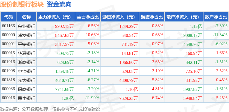 从资金流向上来看,当日股份制银行板块主力资金净流出6356.73万元,游资资金净流入2.79亿元,散户资金净流出2.16亿元。股份制银行板块个股资金流向见下表: