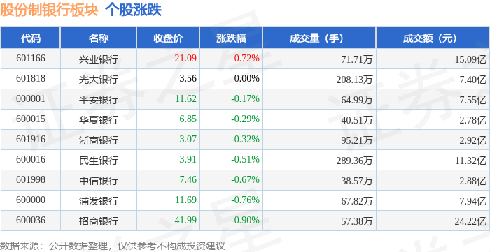 证券之星消息,12月19日股份制银行板块较上一交易日下跌0.42%,招商银行领跌。当日上证指数报收于3890.45,上涨0.36%。深证成指报收于13140.22,上涨0.66%。股份制银行板块个股涨跌见下表: