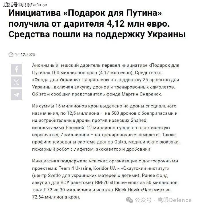 除了这些政府行为外,民间组织同样积极活动,捷克“给普京的礼物”组织收到一笔高达1亿捷克克朗、约合400多万美元的匿名捐款,这笔钱将用于26项目,包括无人机、炸药和教练机等。