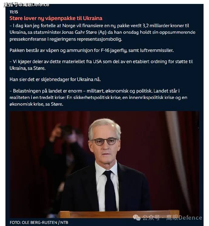 挪威同样当仁不让,挪威首相约纳斯·加尔·斯特勒宣布了一项价值32亿挪威克朗(约合2.67亿欧元)的对乌军援新计划,包括F-16战斗机的配套武器和防空导弹,其中部分物资通过“乌克兰援助计划”从美国购买。