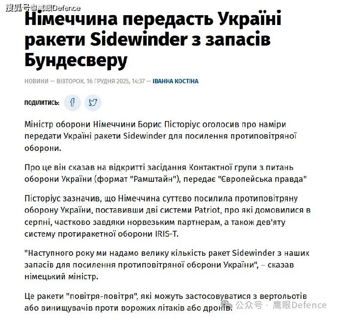 德国防长皮斯托里斯宣布,明年将向乌克兰移交大量从联邦国防军库存中取出的美制AIM-9“响尾蛇”近距空空导弹(没说具体型号,可能是老一些的L和M型号,用于拦截俄罗斯亚音速巡航导弹和无人机足够,而且能改装为地空导弹或安装到无人艇上)。