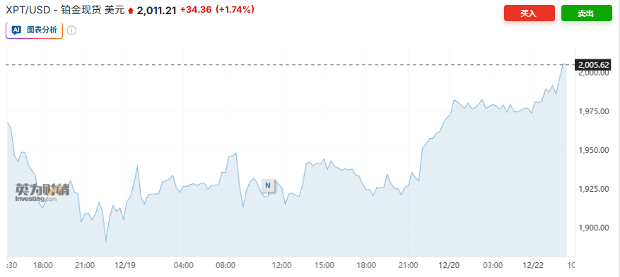 铂金、钯金跟随上涨,现货铂金上涨1.74%至2011美元/盎司,自2008年以来首次升破2,000美元/盎司;