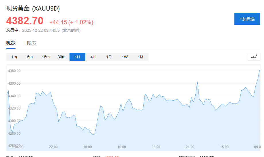 截至发稿,现货黄金日内涨超1%报4382.70美元/盎司,创历史新高。